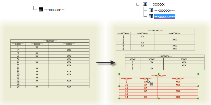 You can split a parts list, hole, revision, or general table, and then relocate the table segments to the desired place on the drawing sheet.