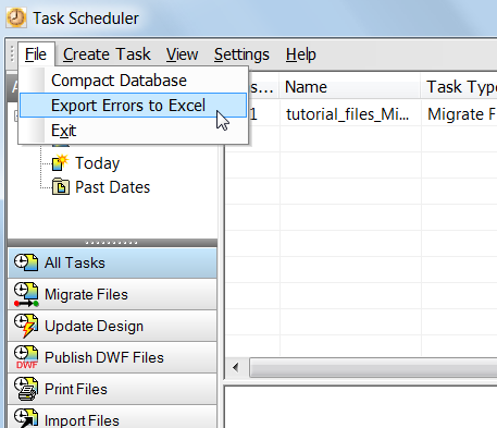 Export Errors to Excel is available on the Task Scheduler File menu, and on the context menu for a selected task.