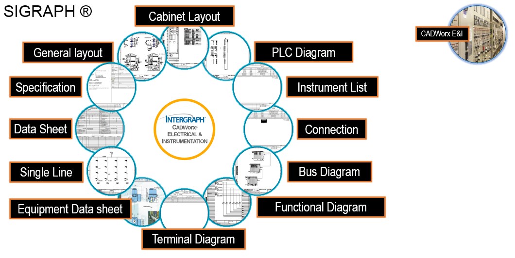 Intergraph umožňuje vytváranie technologických schém “CADWorx P&ID” a prepojenie na meranie a reguláciu (Instruments) + elektro schému zapojenia “CADWorx E&I” (instrumentand electrical design).